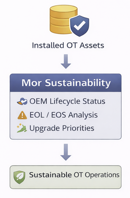 Mor Sustainability addresses a critical but often overlooked OT challenge: asset lifecycle and obsolescence management. It compares deployed assets against OEM lifecycle status to identify components that are end-of-life, end-of-support, or approaching obsolescence.